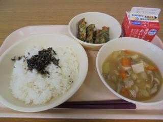 本日の給食は栄養たっぷりの和食でした。献立は、ごはん、しそひじき、ちくわの磯辺揚げ、豚汁、牛乳です。しそひじきの風味がごはんとよく合い、豚汁も具だくさんでとてもおいしかったです。そのなかでも、「ちくわの磯辺揚げ」は子供たちにも大人気のメニューです。各クラスのおかわりジャンケンの行方が気になります!栄養士さんや調理員さんが、毎日子供たちの健康を考えて、愛情たっぷりに作ってくださっている給食も早いもので今週いっぱいで終了となります。