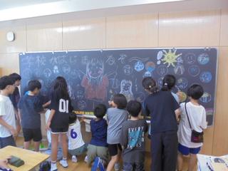 中学年の教室ではさっそく自由研究の発表会が行われており、昆虫の観察日記や手作りの貯金箱、地元の歴史を調べたものなど子供たちの個性あふれる取り組みに驚かされました。また、高学年に「夏休みの思い出を黒板いっぱいに描こう!」という企画をしているクラスがあり、黒板いっぱいに海や花火、帰省先での出来事などそれぞれの夏の物語が色鮮やかに描かれていました。チョークで描かれた作品を見ているだけで、こちらまで楽しい気持ちになりました。さらに高学年の教室では、社会科の学びを生かした「都道府県プレゼン」が行われていました。自分のお気に入りの県の名産品や観光地、歴史などをGIGA端末を使って堂々と発表していました。「知らなかった!」「行ってみたい!」という声もあがり、子供たち同士で学びを深めるよい機会となっていました。