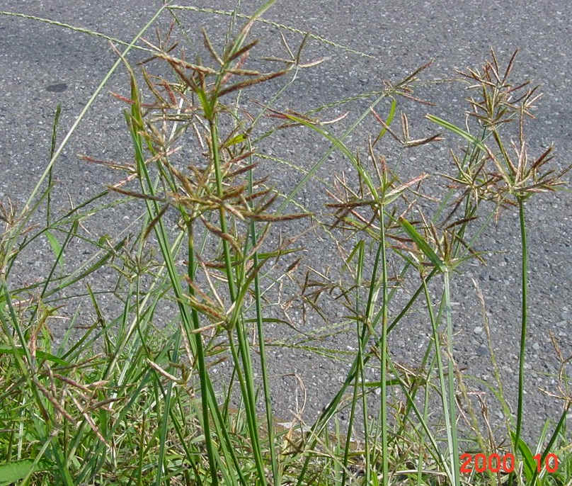 しめった草地や休耕田などに生える一年草です。葉は、根から直接生える根生で、細くてかたく、茎は、直立して、30〜50cmほどだそうですが、この場合は、40cmほどでした。茎の頂上に長い葉(包葉と書きホウヨウと読みます)が2〜3個付き、ここから数本の枝を出します。その枝の頂上に左下の写真のような花(小穂と書きショウスイと読みます)を咲かせます。小穂の長さは、2cm前後、その中に小さな花がたくさん付いています。左下の写真で毛のようなものがたくさんでているのは、雌しべの柱頭(チュウトウと読み、花粉をもらうところです)です。