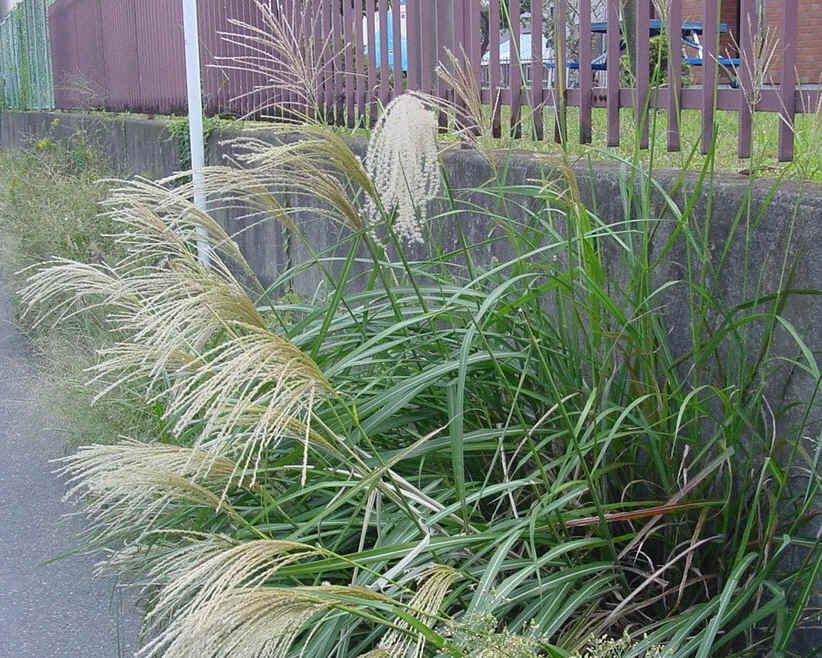 オギは、根茎(コンケイと読み、地下に伸びる茎のことです)がよく伸び、その先から新芽がでるそうです。ですから一本立ちです。ススキは、たくさんの茎が一ヶ所から生えているそうです。これも区別の目安になります。