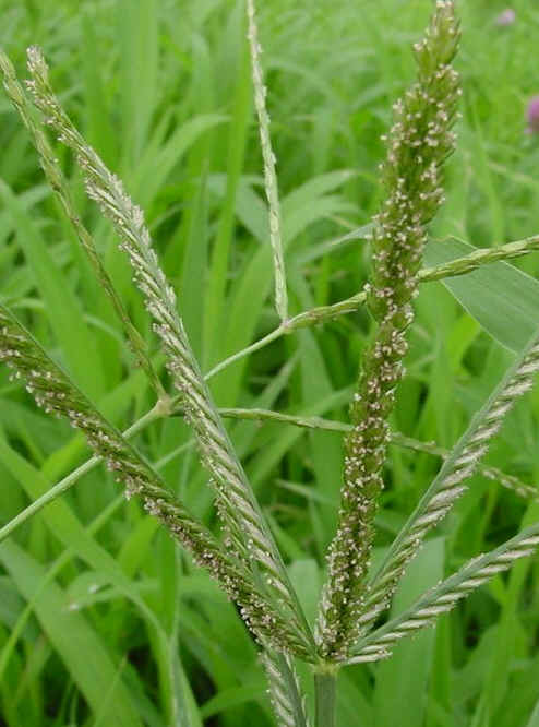 背の高さは、40cmほど、茎の頂上が5・6本に分かれて小穂(ショウスイと読み、この中に5個ほどの花がくっついています)が二列につきます(左下の写真参照)。小穂の長さは4〜5mmほどで、黄色く見えるのは雄しべのヤク(花粉が入っている袋)です。