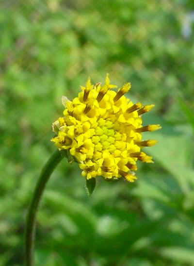 花は、1〜5個の花びら(黄色で舌状花ゼツジョウカといいます)が外側に付いていますが、この場合はもう落ちてしまったようで見当たりません。