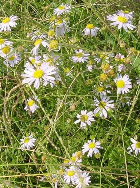 日本の野菊を代表するのがこの花で、日本のいたるところに生えている多年草です。どこででも見られ、量も多く、地下茎をぐんぐん横にのばして繁殖するのだそうです。背の高さは、この場合でも70cmほどもありました。日の良く当たる草原に生えていました。