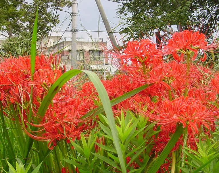 9月のお彼岸(9月の二十日前後)近くになると、あちらこちらにこの赤い花の集団が目につきます。ひょろりと茎が伸びて、その上に15cmほどもあろうかと思われる真っ赤な花が広がります。背の高さは、40cmほど、地中にはラッキョウの形をした球根のようなもの(鱗茎といいリンケイと読みます)があり、それで増えていきます。