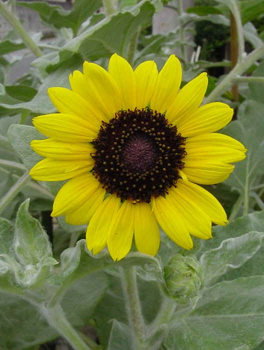 園芸種です。花はふつうのヒマワリと同じように、舌状花(外側の黄色い花びらのことで、ゼツジョウカと読みます。花びらの形が舌に似ているからです)と筒状花(トウジョウカと読み、内側の黒褐色の花のことです。花びらはごく短く、筒のようにくっつきあっているところからこの名前があります。一つ一つの花に雄しべと雌しべがあり、これで立派な花なのです)の二つの花から出来ているのは普通のヒマワリと同じですが、花の直径は8cmほどで小柄です。また枝分かれが多く、ご覧のように葉や茎にたくさん毛が生えていて、そのために銀色に見えます。背の高さも普通のものより低く、4月に種をまくと夏には花を咲かせるそうです。