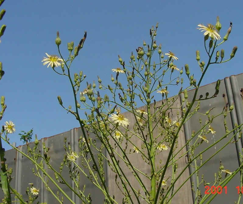 この花にも忘れられない思いがあるのです。知らないということは本当に恥ずかしいことで、なんべんも恥ずかしいことを白状しました。朝、花を見つけました。まだ数が少なくこれからだなあということは分かりましたが、いつ満開になるのか気になって仕方がありませんでした。そこである日の帰り確認しようとここを通りました。すると花が一つもないのです。みんな誰かにもがれてしまったのかなあと本気で考えました。くやしくって仕方がありませんでした。翌日の朝またここを通りました。すると花は見事に咲いているのです。・・・・・。お分かりでしょ。私は資料を読んでみて、一人でくやしい思いをまたかみしめました。この花は夕方にはみなしぼんでしまうのだそうです。それを知らずに誰かがみんなもいでしまったなどと他人のせいにしたのですから、恥ずかしいやら情けないやら・・・。背の高さは2メートルほどもあります。タンポポと同じように、舌状花(ゼツジョウカと読みます。花弁が舌の形に似ているのでそう呼んでいます)だけの花です。どこにでも普通に見られる1〜越年草です。長い葉に切れ込みがなく、細いのでこの名がついたのだそうです。