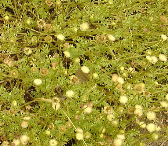 花の直径は、5〜7mm程もあろうか。そんな小さな花が地面に横たわっていました。見つけるのが遅くなり、花はもうかなり終わりに近づいていたように思いましたが、資料を読んでみると花の時期は一年中とありました。そこで又よくよく観察してみると、新しい花ともう咲き終えてしまった古い花とが混じり合っていたのでした。自分で勝手に解釈してしまうというのは、間違いの基になるようで、気をつけなければと思いました。 オーストラリア原産の一年草だそうです。都市近辺の道ばたなどに帰化しているのだそうですが、この花もその一部なのでしょうか。葉は、鳥の羽のようにこまかくさけています。花は、2〜3cmほどの花柄のさきに一個ついています。オスの花は中心部に、メスの花は、外側についていて花びらにあたるものはなく、裸の雌しべがあるそうですが、まだ確認は出来ていません。