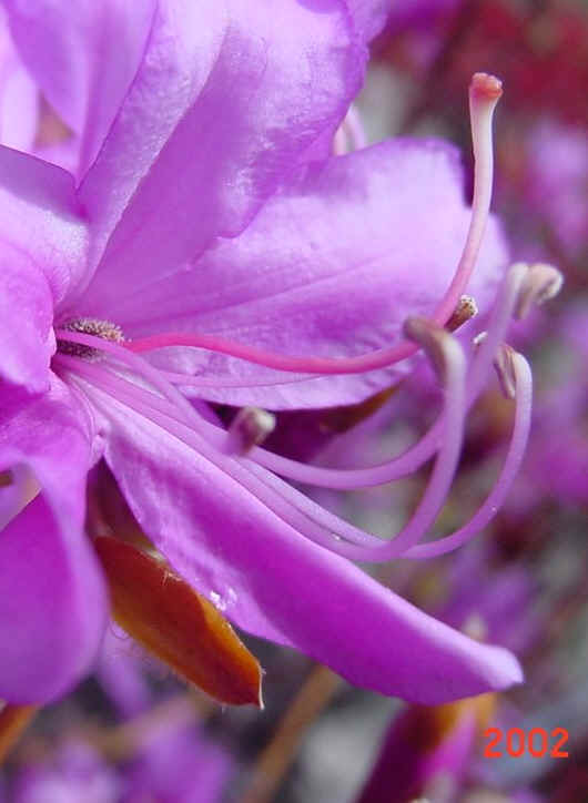 この花の決め手は、雄しべの数です。花の色などは似ているものがたくさんありますが、雄しべが5個と少ないのはこの花の仲間では、この花だけのようです。左下の写真で数えた見てください。また、雌しべが上の方に向かって、雄しべからはなれるように頭(柱頭といい、チュウトウと読みます)を持ち上げています。これはなにか意味があるのでしょうか。この花だけではなく、隣の花も、下の花も、みなそのように雄しべから柱頭を離すようにしています。きっと自家受粉(ジカジュフンと読み、雌しべが自分の雄しべの花粉をもらうこと)をきらうのでしょうか。そんなことを思いました。