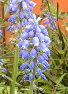 ムスカリとは、ギリシャ語のじゃ香から来ているのだそうで、この仲間の一つがよい香りを出すのだそうです。葉は、細長い線のような形のものを根元から6〜7本出します。青色または赤みがかった青色の花を下向きに咲かせます。この花の大きさは、8〜10mm前後で下の方の花はもう終わりに近くなっていました。もう受粉が終わったのでしょうね。