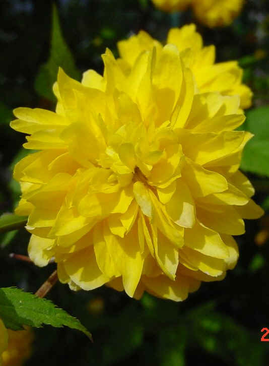 ヤマブキの八重咲きの園芸種です。日本では古くから庭などに植えられていて、ヤマブキの花が終わったあとに咲き始め、このように美しい色合いを楽しませてくれます。「七重八重 花は咲けども 山吹の 実の一つだに なきぞ悲しき」とうたった江戸城をつくった”太田道灌”のうたに出てくるヤマブキは、この花のことです。左下の写真のように、雄しべは見当たりません。花弁(カベンと読み、花びらのことです)に変わってしまったのです。雌しべも退化(タイカと読み、長い時間をかけて無くなってしまうことです)してしまったので、果実は出来ません。背の高さは、1.5〜2�。ほどになりますが、この場合は1.7�。ほどでした。同じ4月の目次にヤマブキがのっていますので、参考にして見たください。それにしても清楚で、きれいですね。
