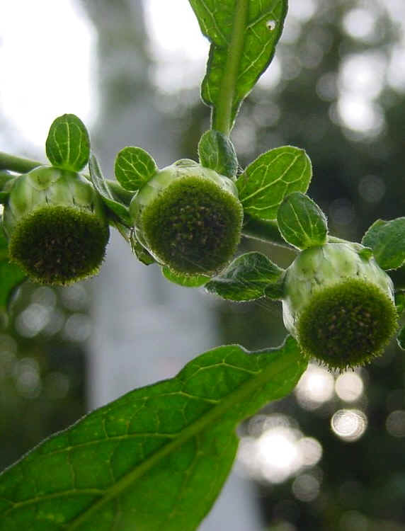 日本全土、家の近くや野原などどこにでも生えている越年草(エツネンソウ:秋に種が落ち、冬を越して花が咲き果実を結ぶ植物のことです。2年草ともいいます)です。独特の匂いがあり、せのたかさはほんらい60〜90cmほどなのですが、この場合は一度除草され、それから再生したようで、50cmほどでした。根生葉(コンセイヨウと読み、根から直接生える葉のことです。)は特に大きくたばこの葉に似ているということから、この名前がついたそうです。花は、葉と茎の間から下向きにつき、ごらんのように並んでついているように見えます。舌状花(ゼツジョウカと読み、舌のような形をした花弁のことです)はなく、筒状花(トウジョウカと読み、花弁の根元がくっつきあって、筒のようになっている花のことです)だけですが、外側の筒状花は、雌しべだけの花で、種は出来ません。中側の花は、両生花(リョウセイカと読み、雄しべと雌しべがある)で種が出来るそうです。花の直径は、1cmほどです。この場合はまだ花が満開ということではないようで、筒状花の黄色が少ないようです。左下の写真で確認してください。