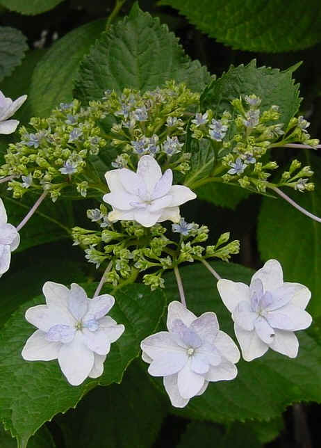 ヤマアジサイは、日本各地の山などに多い落葉低木だそうで、高さは1メートルほどで、この場合も1メートルほどでした。葉は、柄を持っていて、向かいあって付き、だ円形で先はとがり、まわりにはご覧のようにギザギザ(きょ歯:キョシと読みます)があります。中側にある本物の花(両生花といい、リョウセイカと読みます)には、ガクが5枚、花びらが5枚、雄しべが10本、雌しべの花柱(カチュウと読み、メシベの一部分です)は、3〜4本あるそうですが、この場合は写真で見てもお分かりのように、雄しべなどはたくさんは見えません。そんなことから園芸種ではないかと思いました。