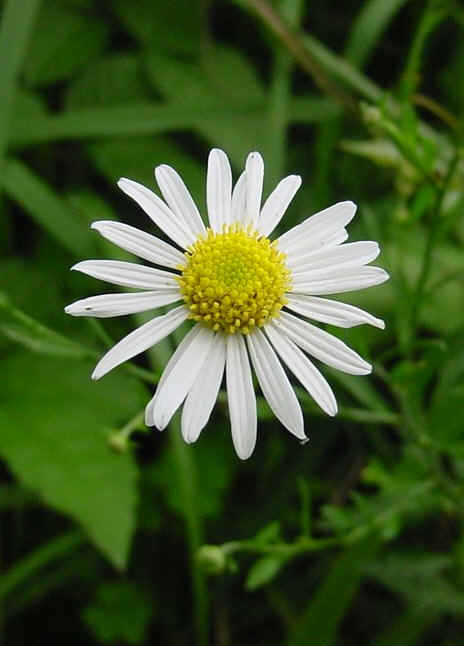 細い茎の頂上に、直径が2.5cmほどの頭花(トウカと読み、菊の花のようにたくさんの小さな花が集まって一つの花のように見える花のことです)を一つ付けます。外側の花びら(舌状花といいゼツジョウカと読みます)は、白色ですがほんのわずか紫色を帯びています。中心部の筒状花(トウジョウカと読み、短い花びらが筒のようになっています)は黄色です。ユウガギクという名前は、柚子(ユズ)のような香りがするところから、柚香菊という漢字を書き、ユウガギクになったのだそうです。
