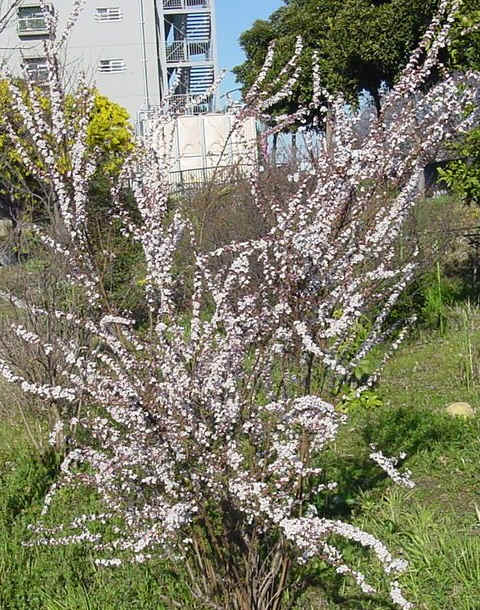 この花は、もちろん園芸種です。上の写真に見られように、この花には花の名前を書いた札がはってありました。そこには「ももいろ雪柳」と書いてありました。なるほどと思い、なっとくできました。花が本当にもも色なんですね。つぼみはもっと色が濃く、はなれて見ると全体がピンク色に見えます。資料を調べてみました。残念ながら「ももいろ雪柳」という名前には、お目にかかることは出来ませんでしたが、ユキヤナギのたくさんある園芸種の中で、つぼみが濃いピンク色で、これまでになかったこのような色が生まれたのがこのユキヤナギ・フジノピンクと出ていました。名札を付けてくれた方に申し訳ないのですが、花の呼び方はいろいろあるようで、たいへん困るのですが、資料を尊重しようと思っています。この花には何にも関係ないことなのですが・・・それにしてもとてもきれいですね。