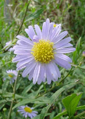 花は、直径3cm前後で、外側の舌状花(ゼツジョウカと読み、この根元に雄しべと雌しべがあります)は紫色ですが、中心の筒状花(トウジョウカと読みます。管状花:管状花という場合もあります)は黄色です。種が出来て、タンポポなどは風に揺られて空に舞い上がりますが、この花の種は毛(冠毛:カンモウと読み、種の上の方につく毛のことです)は、とても短く、飛ぶことが出来ないようです。葉や茎、花などには、匂いがあり、若い芽は食用になるのですが、もっともおいしく、優しい美しさがあるところから嫁菜(ヨメナ)と名付けられたようです。婿菜(ムコナと読みます)というのもあるそうです。